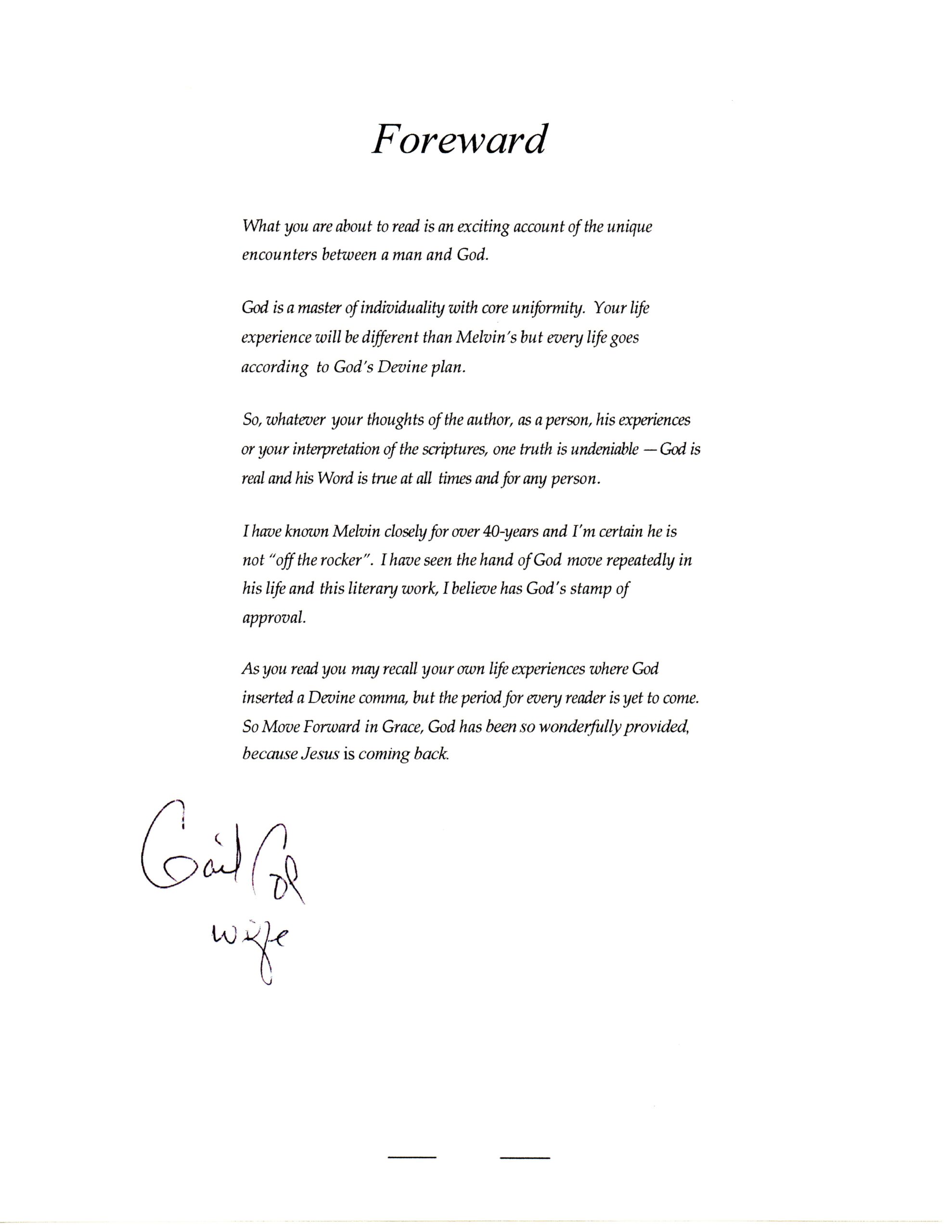 Move Forward in Grace by Melvin L. Coe, Sr. is an inspirational book. This book should be read by persons of all ages who feel that they have gone through many trials and tribulations and feel that they can not go on. Melvin L. Coe is a living example of an individual who God has continued to strengthen and place in other peoples lives to help them continue through hard times no matter what the challenges.